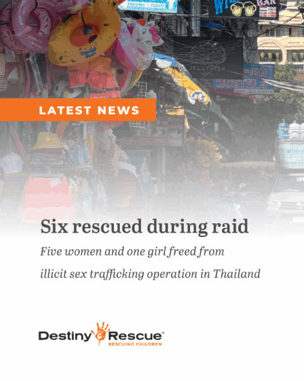 Destiny Rescue agents collaborated with Thai law enforcement by providing undercover work, surveillance and intelligence gathering to prepare for the raid. Their findings uncovered that a local karaoke bar was acting as a front for illicit sex trafficking. The ensuing raid was a success; the women were all returned home safely, and the child was entrusted to a local shelter to recover from all she had endured.
